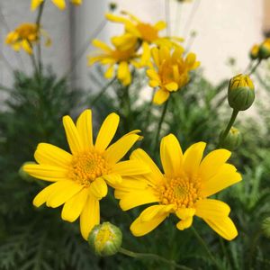 大型台風🌀24号の通過後の晴れ☀️.° マーガレットコスモス🌼 花期は、長く4月〜12月だけれど… 秋が最盛期で一番綺麗🌼✨ 茎の頂部の葉の付け根から長い花茎を伸ばし3〜4cmの黄色の花🌼たくさん咲いて風に揺られて可愛いです😍💓