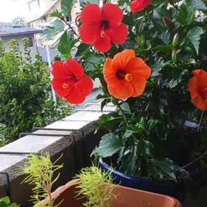 今朝のハイビスカス🌺 コキアの子供と💕💕 大きくなったコキアとハイビスカス🌺の ツーショット撮れるかな~❔σ(^_^;)?💚