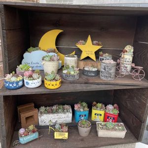玄関前♡︎ りんご箱に寄せ植えの多肉たち🌱 リメ缶や、ブリキ鉢などなど。 りんご箱は無料でGETして、防腐剤を塗り塗りして完成♪
