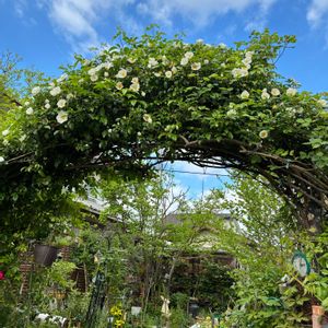 1〜3枚目 我が家のナニワイバラのアーチ🏷️土曜はお空の発表会 に咲いてくれました❣️オープンガーデンの時には枯れてしまいますが、それでもやっぱり🥰 4枚目 GS友に貰ったポピーブラックマジックも👌 5枚目 オープンガーデン仲間宅のチューリップは、もはやボタン!?