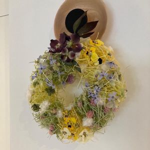 もくめんリースのワークショップ🏵 ネモフィラ&紫陽花&オダマキ💙 モナルダ&エクレール&オレガノ&ユーカリ💚 ひと足早く春が来たようなオーナメントが出来上がりました🌸