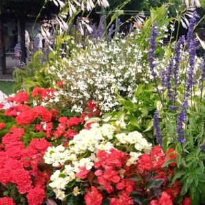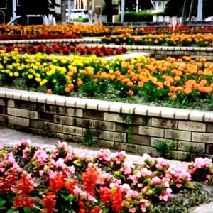 公園の花壇。 色とりどりの花が満開です。