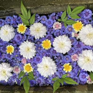 今日のお花、矢車菊の花手水 毎年零れ種からたくさん咲いてくれるので、躊躇なくバケツいっぱいにお花を✂️ アクセントカラーの🌼春菊は隣のうちの畑からいただきました。 お水に浮かべるのは気持ちよくて楽しくて大人の水遊びになってます💦