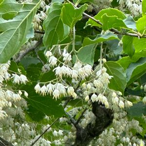 オオバアサガラ エゴノキ科 アサガラ属 落葉小高木 山地の渓谷沿い、💦の流れるような所でも可 時には乾地にも ☘️🍃長さ 15〜20cm 広楕円形 縁には線状の低い鋸歯がある、細脈は裏側に突き出る 💐🌼枝先に垂れ下がる複総状花序に白い💐🌼を多数付ける picは咲き始め。 分布 本州〜九州