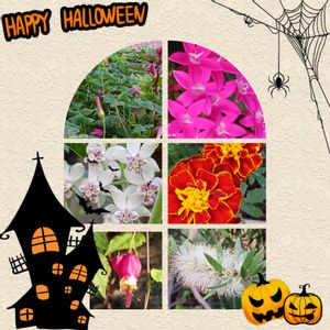 おはようございます🙇 ハロウィンも今日で終わりですね☺ 昨日散歩で会った花達をコラージュしてみました❤ 若い方達はハロウィンを楽しんで下さい🎵 2枚有ります見てね❤