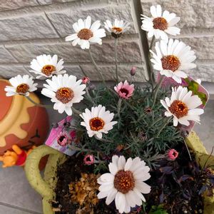 💗姫小菊withローダンセマム💗 先月🆙した時には この姫小菊(ブラキカム)3色たち❁と ダリアのエタニティが一緒でしたが ダリアは花後にお引っ越し(掘り起こし) しちゃったので、代わりにお迎えした ローダンセマムのアフリカンアイズ 少しずつお花が咲き始めました♡ 今朝方までの雨も上がり⤴️ 今は☀️お日様が眩しい✴️くらいの快晴です🙌 昨日まで頭痛💥と軽いめまい🌀が続いていたので キャンセル🆑しようかな😞と思っていたけど やっと薬💊が効いて来たみたい⤴️😃なので 午後から予定通りに美容室💇へ行って来ます🎵