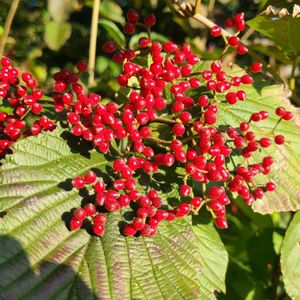 ミヤマガマズミ ガマズミ科?(スイカズラ科?・レンプクソウ科?)ガマズミ属の 落葉低木 森に入ると、真っ赤に色づいた実が、パッと目に入ってきました。 近くの畑に、家族で収穫にやってきた方が、「ミヤマガマズミ」 と教えてくれました。 「子どもの頃のおやつだった」と言いながら、一粒つまんで食べました。 「もうちょっと、熟したほうが美味しいな」と、 食べるには、少し、早かったようです。
