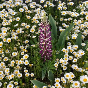 我が家のノースポール。の中に勝手に出たルピナスが😆種が飛んだのかな🤔周りに守られている感じです😊