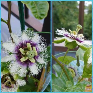 パッションフルーツ咲きました!! 下には、ちゃんと果実ついてます😆 今年はたくさん食べられるかな…。 去年の収穫は2個でしたので、今年こそ💦