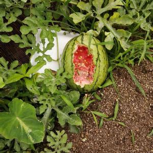 1週間留守にしているうちに 食べられたー。 大阪の畑の 小玉スイカ たぬき?イタチ?カラス?