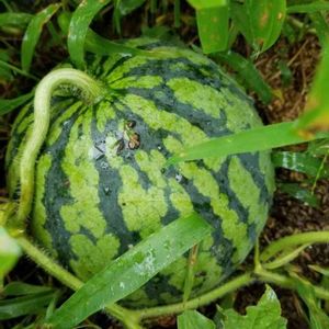 カラス被害のスイカ🍉👨🌾 傷口が、成育と共に塞がれずに 果肉にアリが侵入しています。 完熟で無く腐敗して来ています😅