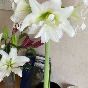 アマリリス3輪目が咲きました✨ 向きがバラバラだから 上手く撮れなかった😓 隣のユリより大きいです✨