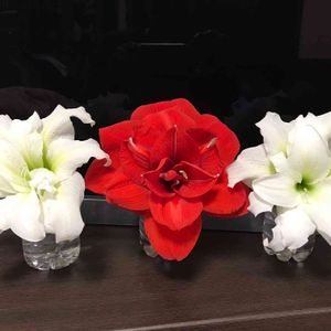 アマリリスが満開になりました✨ 4輪がバラバラの向きなので 1つにまとめてみました🍀