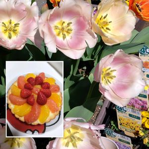 🌷チューリップ🌷 病院🏥から帰宅したら 🌷がパッカーンしていました🤣🤣🤣 朝見たときはまだ目覚めていなかったのに(笑) 中心がクリーム色で全体が薄いピンク🟡🩷 春にはお似合いの🌷 今日のオヤツは カスタードクリームの フルーツタルトです。 昨日の夜に作っておいたので折角の生地が少しパリパリかんが無くなっていましたが美味しく先程食べましたがまだ残っているので良かったら どうぞ召し上がれ(*^^*)