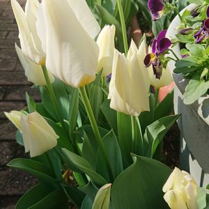 『チューリップ』白 今年一番咲きに咲いてくれた チューリップ🌷さんも ここ数日の暑さと今日の強風で 散り始めてしまいました😭 お掃除してお花を✂️して御礼肥をあげておきます✌️