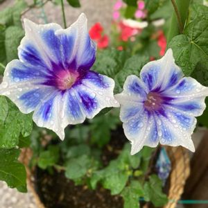 💙西洋朝顔スノーフレーク💙 桔梗咲きと言う事なので♪ 我が家の今朝開花した桔梗と…♪♪♪ 💙(*^-^)/💜\(*^-^*)/🤍\(^-^*)💙