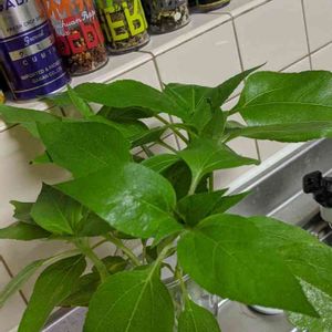 間引いたヒマワリがもったいなくて、とりあえずコップに生けてみた。このまま咲いたりしないかなー。