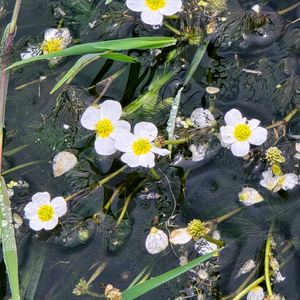 バイカモ(梅花藻) キンポウゲ科キンポウゲ属の多年草 少し前、オオカナダモをバイカモだと思い込み、投稿しましたが😅 、 やっぱり、本物のバイカモを観たいので、バイカモの名所?に出かけてみました😆 ①②…醒井養鱒場 バイカモは、絶滅危惧種の「ハリヨ」の産卵場所にもなるそうで、 ハリヨの展示されている池に生えていました。 ハリヨは、岐阜県と滋賀県の生息地がごく一部に限られたトゲウオ科の淡水魚で、体にトゲを持っています。 ハリヨの姿もガラス越しに見られましたが、ガラスの汚れで、見え隠れして、ハッキリ写りませんでした😓 ③④…丹生川 田んぼや畑が広がっている集落の間を流れている小さな川に、何気なく、花を咲かせていました😆 ⑤…地蔵川 醒ヶ井宿を流れる川で、 水温が年間、14℃前後の清流とのこと。 暑い中、ポツポツ、観光で訪れた人たちがバイカモを観賞していました。