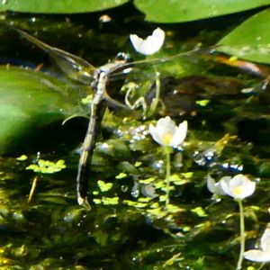 バイカモ咲く池で、シオカラトンボが産卵していました🎵