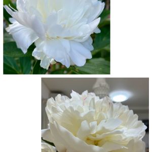 ↖️芍薬 白雪姫。 なんとか開いてくれましたが小さい… 20cm超えと聞いてたけど10cmくらい😥 ↘️妻が職場で貰ってきた切り花用の芍薬。 15cm程で十分見応えあり。 来年は大きく咲かせるぞ〜