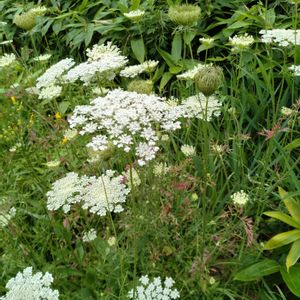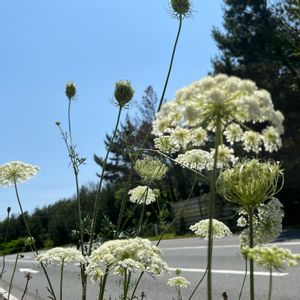 ノラニンジン(野良人参) セリ科ニンジン属 西アジア〜ヨーロッパ原産 道路脇のフェンスに爽やかなレースの花が並んでいます🤍🥰 根は直径1cmくらいで黄白色、食べられないそうです 日本全土で見られて、北海道では普通だそうです 真ん中に暗紫色の花が付く物もあり、「アン女王のレース」とも言われるそうです これは、白い花だけでした🤍😃🎶 花期: 7〜9月