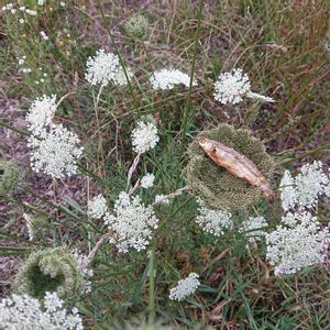 ノラニンジン(野良人参) 別名 クイーンズアンレース *セリ科ニンジン属 花期は7〜9月 ヨーロッパ原産の帰化植物! 全国の道端や畑.荒地に生える一年草〜越年草! 高さは0.5〜1.5m 茎の先に白い複数花序を密集して付ける! 花序の中央部にしばしば暗褐色の花が数個混じる! この理由はハッキリとはしませんが、受粉の為に虫をお引き寄せるためだとされています! ①蒲生干潟の海岸に! ③暗褐色の花のアップ! ④糸状の萼片と鳥の巣状の花後! そして昨年、花友さんの投稿で知った 「アン王女がレースを編んでいる時に針が指に刺さり流した血の痕」 と言う言い伝えのある花に今年はしっかりと出会えました❣️ 7月21日撮影