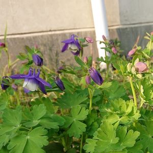 オダマキさん咲きました💙💜 いっぱい咲いた鉢植え🪴のは俯き加減でした。菊とかすみれのこぼれ種が育っている鉢植えのは割と上向いていて見やすかったです😍