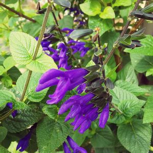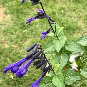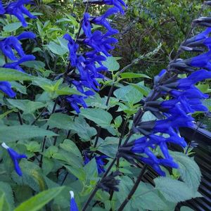 今日の私のブルーの花🫐💙💚 「サルビア・グアラニチカ」の花 (別名:メドーセージ) 花壇の中で綺麗に咲いています💜💙💚 サルビアの仲間ですね🤗 科名 シソ科 学名 Salvia guaranitica 別名 メドーセージ 原産地 南米 大きさ 60cm~1.2m 主な開花期 4月~11月 耐寒性 ややよわい(霜・凍結注意) 難易度 ★★☆☆☆(そだてやすい) 支柱立て 茎が細い場合は、開花時期に倒れやすいのであらかじめ支柱を立てておきます。 日当たり・置き場所 日当たりの良い場所で元気に育ちます。半日陰の場所でも育つのですが、極端に日当たりが悪いと花付きが悪くなったり、茎がひょろひょろになるので気をつけましょう。 本来常緑性の植物ですが、日本の冬の寒さで落葉し、春に気温が上がると株元や生きている茎から芽を出して復活します。 冬越しのポイントは地下茎や根を凍結から保護すること、茎を霜や寒風から守って枯らさないことです。ただ、ある程度の耐寒性はあるので平地や暖地なら特に防寒しなくても冬を越します。不安な場合は株元を腐葉土などで被うマルチングをし、鉢植えは寒風を避けられる場所に置きます。 ʕ•̫͡•ʕ•̫͡•ʔ•̫͡•ʔ•̫͡•ʕ•̫͡•ʔ•̫͡•ʕ•̫͡•ʕ•̫͡•ʔ•̫͡•ʔ•̫͡•ʕ•̫͡•ʔ•̫͡•ʔ