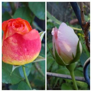 今日も快晴☀️ つるバラさん達です🌹 ← お馴染み「ふれ太鼓」 オレンジ色が鮮やかです❗️ → 「アムールドゥランジュ」 優しいピンク色です❗️ フックラさんとホッソリさん🌹🥀 どちらも八重咲きなんです💖