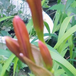 ウヒョ~~‼️ 見つけちゃった! 雑草に紛れて 蕾をつけてるこの子? 植えた覚えはないのに🤔 色からして多分 「ナツズイセン」♥ 花が咲いたらupしま~す‼️