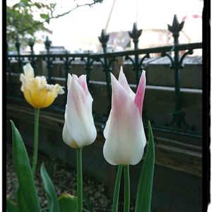 チューリップ🌷‼️ 今やっと‼️😆✌️ 一昨年前に🐕繋がりのクッキーママに頂いたミックス球根なんです😃❕💗 奥の黄色のチューリップは数日前から咲いていたんだけど、一緒に投稿したくて待っていたら、終わりのようです(^o^;)💦 まだ咲きそうなのもあるけれど・・・・・ 日中花びらが開いていたのが夕方になってシャキッと‼️ 🙌🎵~ 沢山球根頂いたのに、パラパラしか咲かせられなくて・・・ ごめんね~🙏💦💦 球根は増えていて、このあたりにたっくさん植えてはいるんですよ~‼️ 葉っぱも茎も残して球根育ててます、で、昨年と違うのが咲きました❗