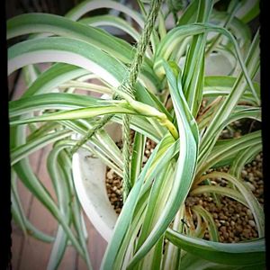 嬉しい発見‼️初めてのランナー‼️ (追記*次の日、またランナーが出てきてました‼️これでランナーは2本になりました) オリヅルラン ボニーちゃんに 待望の子株の兆し‼️(;∀; ) 嬉しい🎵😍🎵‼️🌀🌀🌀🌀 ロビチビちゃん、ついにやったよ~~❗🍀😌🍀 吊り鉢にまとめたのが良かったのかな~ でも、1週間前だよ? さあ、どんどんおいで~~❗