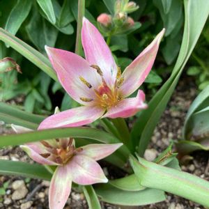 おはようございます🌷 原種系チューリップ🌷 お日様に当たるとパーっと開き 夕方には閉じます✨ 6枚の花びらのうち3枚の花びらの外側がピンク色💕 閉じたところも可愛い😍
