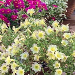 ずーと咲いているユーフォルビアです♡ 梅雨の長雨や 真夏の日差しにも 強いです🍀 奥のは昨年から冬越しして咲いているペチュニア💕