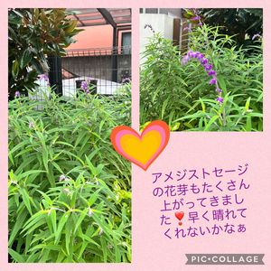 今朝は雨模様☔️ だからではないけれど、アメ(雨)ジストセージ😉 雨の重みで、うなだれてしまってます。 アメジストセージは、下からたくさん芽が出てきますが、土地有効活用で、毎年、数本だけを育てて、まとめて上の方で花咲かせてます。