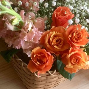 今週のお花💕 バラ🌹はミルバです サーモンピンクのストック 久しぶりのかすみ草 10年くらい前に作った 紙バンドの籠に入れてみました この籠がとっても丈夫なんです