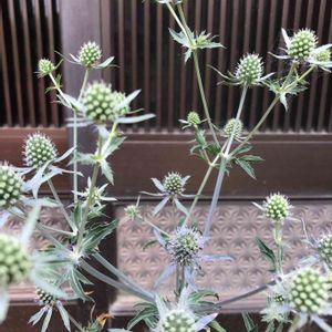おはようございます😃 念願だったエリンジュームの花が、咲き始めました。紫色が少しついてきました。 感動しています。