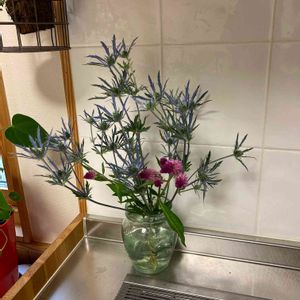 朝ホームセンターに行ったついでに切り花を買ってきました🙂 エリンジウム?と書いてありました☺️ 綺麗💙
