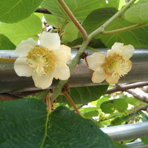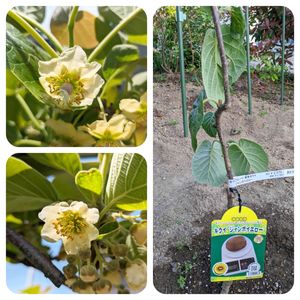 キウイ🥝花が咲きました。 キウイの花の香りは良いかおりなんですよ〜🥰 母が植えたキウイ、オスとメスの植える場所を間違えて 棚の下がオス 棚から遠いところにメス になってます😱 オスの方が勢いもよく花もたくさん咲いているので、人工授粉させなくても大丈夫じゃない?なんて思ってます 今年棚のパイプの近くに新たに苗を植え付けました🥝 ジャンボイエローという品種です 大きいのは食べごたえありそうね😋😋