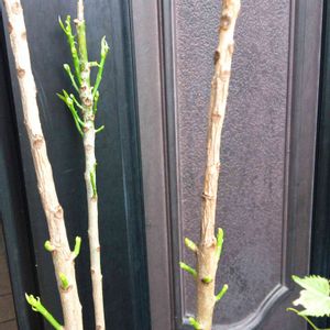 タマラさん日光浴☀️ 支柱立ててあげたらなんだか立派になりました😆 新芽も出てきて調子良さそう❓ 黒ポットのままなので早くお似合いの鉢を見つけて植え替えてあげたい😂