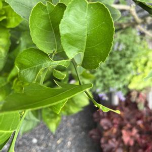 2025年7月22日 火曜日 5:25 庭に植えたマイヤーレモン 新芽が出てきていい感じ❗️ と思って写真を眺めていたら アゲハチョウの卵ついてるぅ😣 結構強めに接着してるものですね🥚 今しがた手でこそげ落としできました。