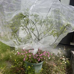 レモンの木 去年はアゲハチョウの産卵場所になり丸裸だったので、今年はネットをかけることに!去年は駆除が追いつかなかった。 百均のネット2枚を繋ぎ合わせでどうにか…ちょっと窮屈そう。 先週末、アゲハの卵と幼虫を発見し、急いでかけたネット。 3日後の今日、点検したらちゃっかり幼虫がネットの中に!! そんなこともあろうかと、チェックして良かった〜 ついでにネットの中に支柱も立てた! ネットを掛け外ししてる間もレモンのいい香り アゲハも香りに釣られてヒラヒラと飛んできた💦 ネットでガード!! 来年はもう少し大きなネットを、もう少し早い時期にかけたいな。