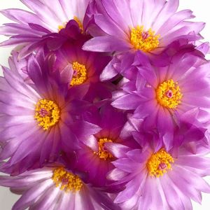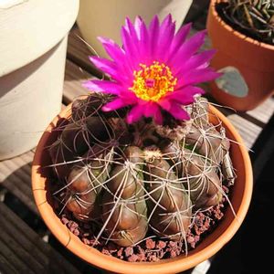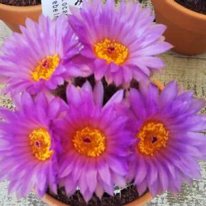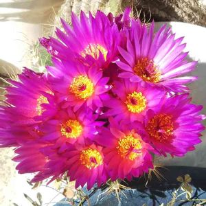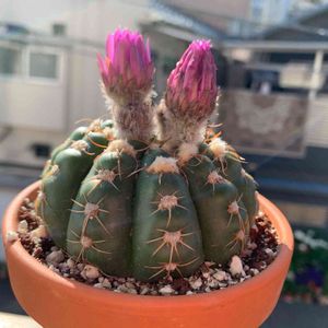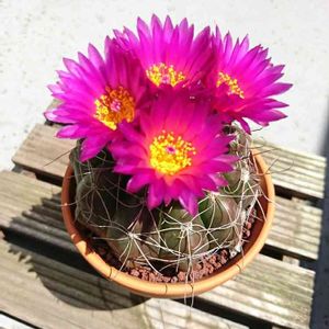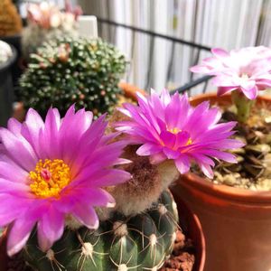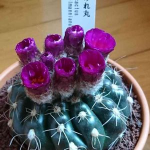 こんにちは! ひと月くら前に日曜市で買ったサボテン✨ 2つで500円と言うお安さでした😊 今日ようやくお花が咲きました💞 まあるいお花が一斉に咲きましたよ💗 すみれ丸と言うお花らしいです👀