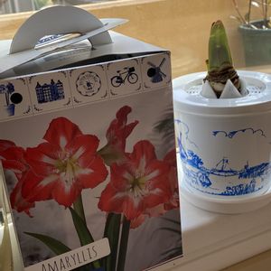 お久しぶりです❣️ 花友の皆さまお元気ですか? 3月の初め、東京の花友さんからステキな春の🎁…アマリリスの大きな球根が届きました。 ミネルヴァという名前のアマリリスさんで、先日、山Pの「正直不動産」で、ライバル会社の名前になってましたが…ローマ神話の女神を意味するお名前だそうです。 私は2月末からちょうどイタリア旅行に出かけており、旅の最終地ローマから帰ったら、この子が待ってくれていましたよ🇮🇹 今は芽が出て🌱、ニョキニョキ4枚に👍 赤と白の大輪になってくれるのか⁉️さあ、今から楽しみです。 3枚目は、ラフなお茶席での一枚。なんか春らしくていいでしょう‼️ 🟢のお茶碗に緑のお抹茶。落雁は金閣寺オリジナルのお菓子で、金閣寺の鳳凰の型押しに金箔が。中は大徳寺納豆の入ったこし餡で、すごく美味しかったです。イタリア土産のチョコはイースター🐣にちなんで‼️ 我が家の3年目クリスマスローズ…大鉢に移したら、やっとモリモリに咲いてくれました。 SKYも元気にしています💓 近況報告かたがた… それではまた〜