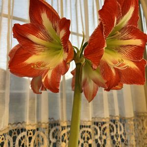 ミネルバ 4輪すべて咲きました。 アマリリスが花のボリュームもですが背丈がこんなに巨大になるとは知らなかったです😰
