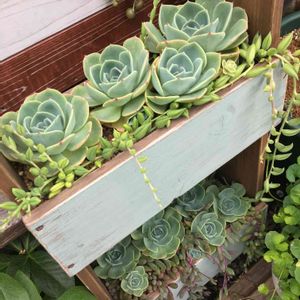 KOHサンの七福神companyに入れてもらいました( ̄^ ̄)ゞ よろしくお願いします(。-人-。) やっと撮った七福神はコチラ❁⃘*.゚ 去年の夏越しで溶けかけてた子と秋に✂️したお子様をまとめて入れてあるラダー風プランターです(*ˊˋ*) あと出来心でちょっと挿したネックレス系💦侵略がすごい(‘、3_ヽ)_ 下の段は日当たりがイマイチで顔色が良くないけど今年の夏越しはここで頑張ってもらいます💦 異変はいつも七福神から始まるのですでに:( ;´꒳`;):ビクビク