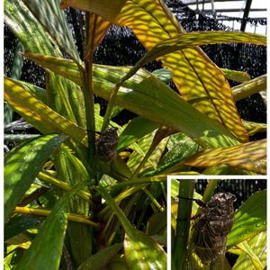 梅雨明け間近で例年より遅い蝉の声、数も少ないです。蝉さん日よけの下でひと休み、水やりしたら面倒臭そうに飛び立って行きましたよ。