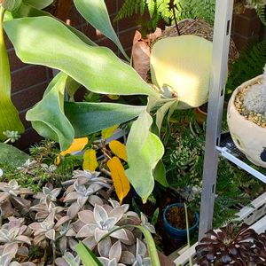紅葉でもう一つ。 ビカクシダの葉の間から黄色い葉が見えます。 細葉イヌビワが綺麗に紅葉しています。良い色です。 来春は、可愛い鉢に植え替えて見られるように仕立てたい。
