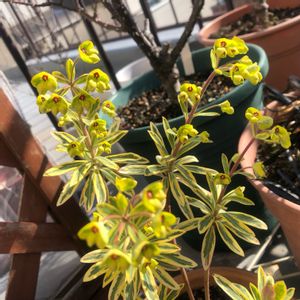 ユーフォルビア アスコットレインボー 開花 2年目2回目の開花💕株もお迎えした時は手のひらサイズでしたが今は50cm程の背丈になりました。昨年初め お迎えした時は冬で赤色の葉っぱも目立ちましたがこの冬はあまり変化なかったな🤔 同じ鉢にユーフォルビア ブラックバードと寄せ植えにしているのですがブラックバードさんはまだお花は咲く気配がありません。いつ咲いてくれるかな〜🥰 🏷斑入りフェチ
