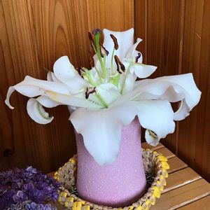 ミレッシモ 白い大輪の百合 淡いピンクの縁取りが有ります。